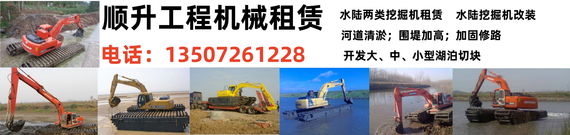 顺升工程机械租赁有限公司主营: 湿地打桩设备出租、租赁水陆挖机、租赁水上挖掘机租赁水上挖掘机、租赁湿地挖机、,我们将本着与客户真诚合作、做客户可靠朋友的宗旨,为您提供优质服务!服务三保:保证质量、保证时间、保证数量。经营原则:顾客至上、质量优良、品种齐全、价格合理公司的经营理念:同样的产品比质量、同样的质量比价格、同样的价格比服务、同样的服务比信誉。服务宗旨:雄厚的实力、优质的品质、低廉的价格、的服务。郑重承诺:以z u i好的产品、z u i优的质量、z u i低的价格、z u i完善的服务、来答谢新老客户的信赖。经营原则:顾客至上、质量优良、品种齐全、价格合理、诚信为本、共创辉煌。